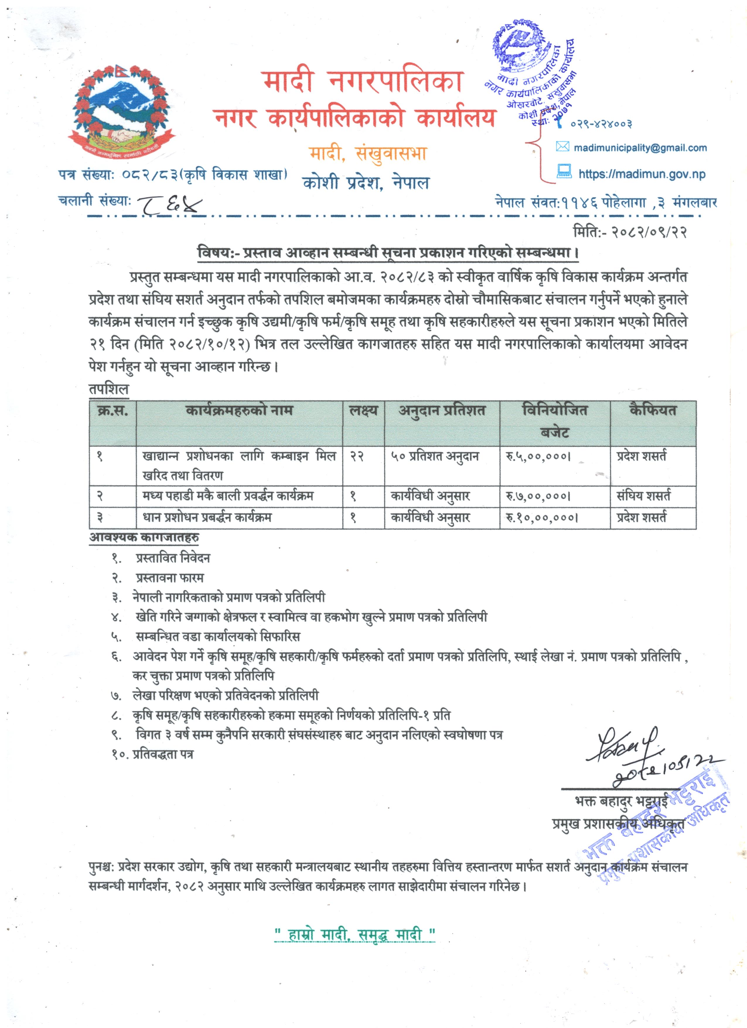 प्रस्ताव आव्हान सम्बन्धी सूचना प्रकाशन गरिएको सम्बन्धमा ।