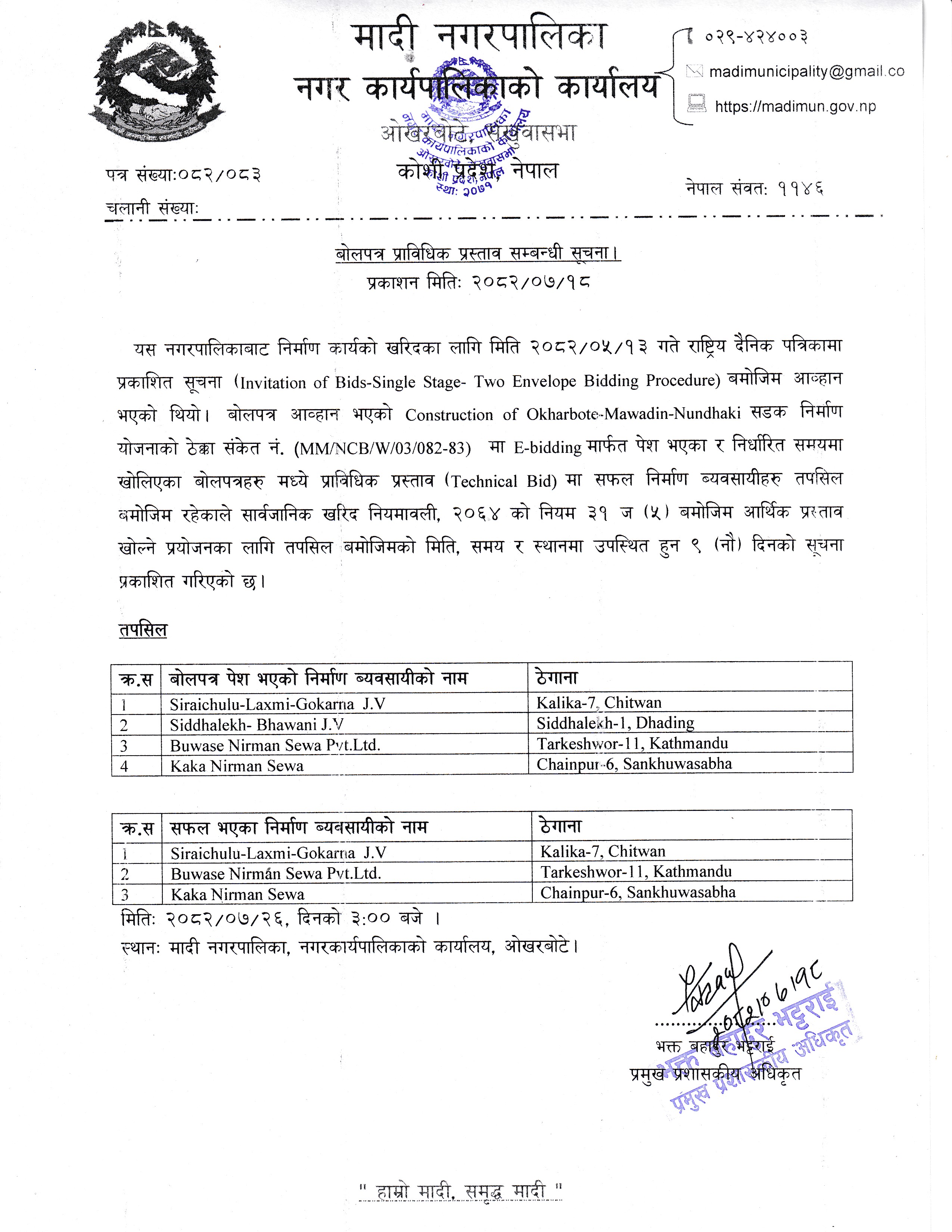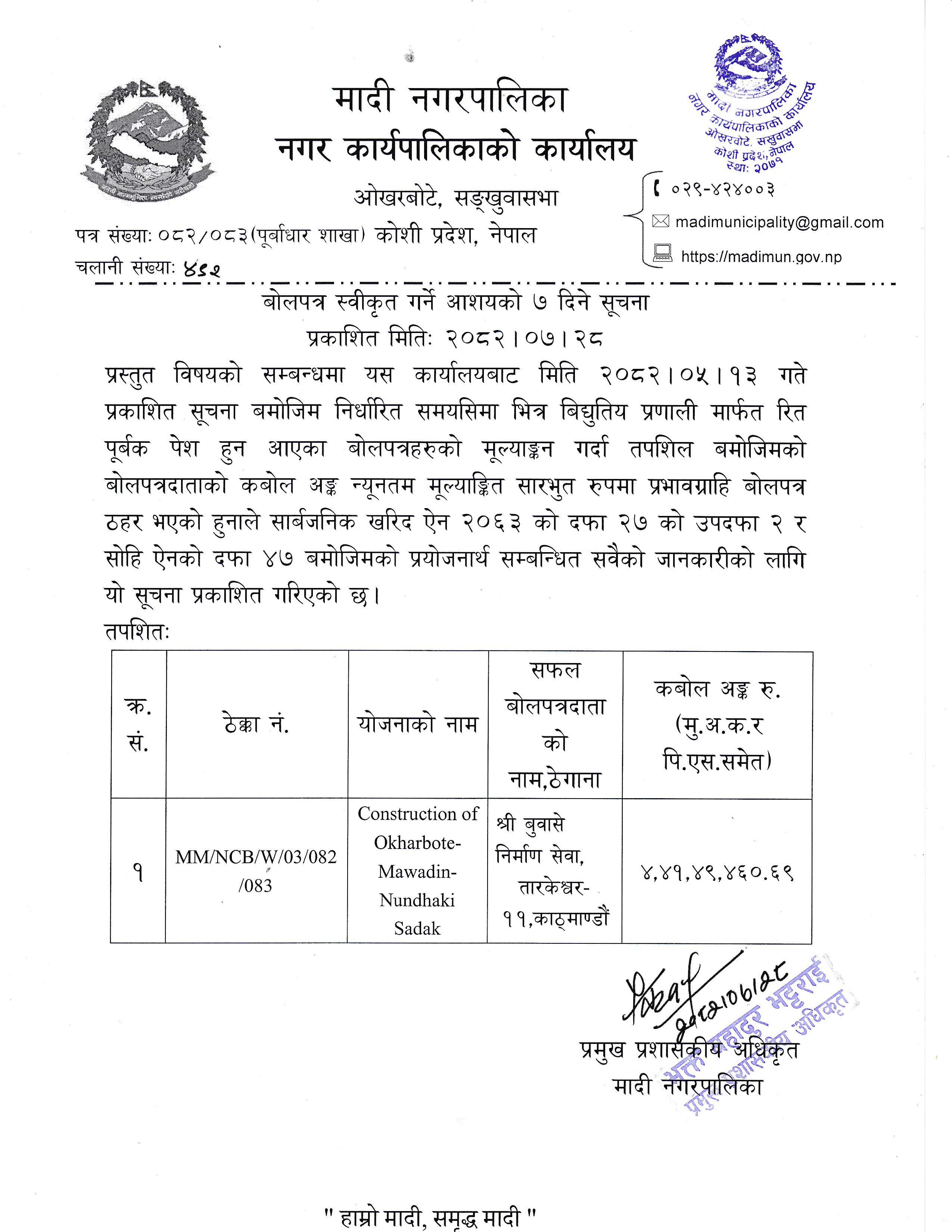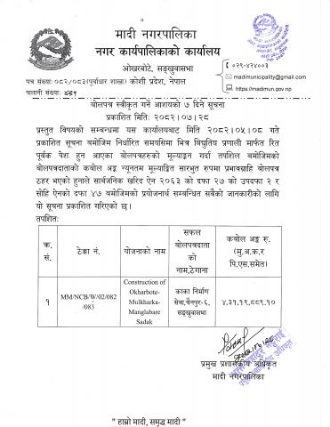 बोलपत्र स्वीकृत गर्ने आशयको ७ दिने सूचना प्रकाशन ।