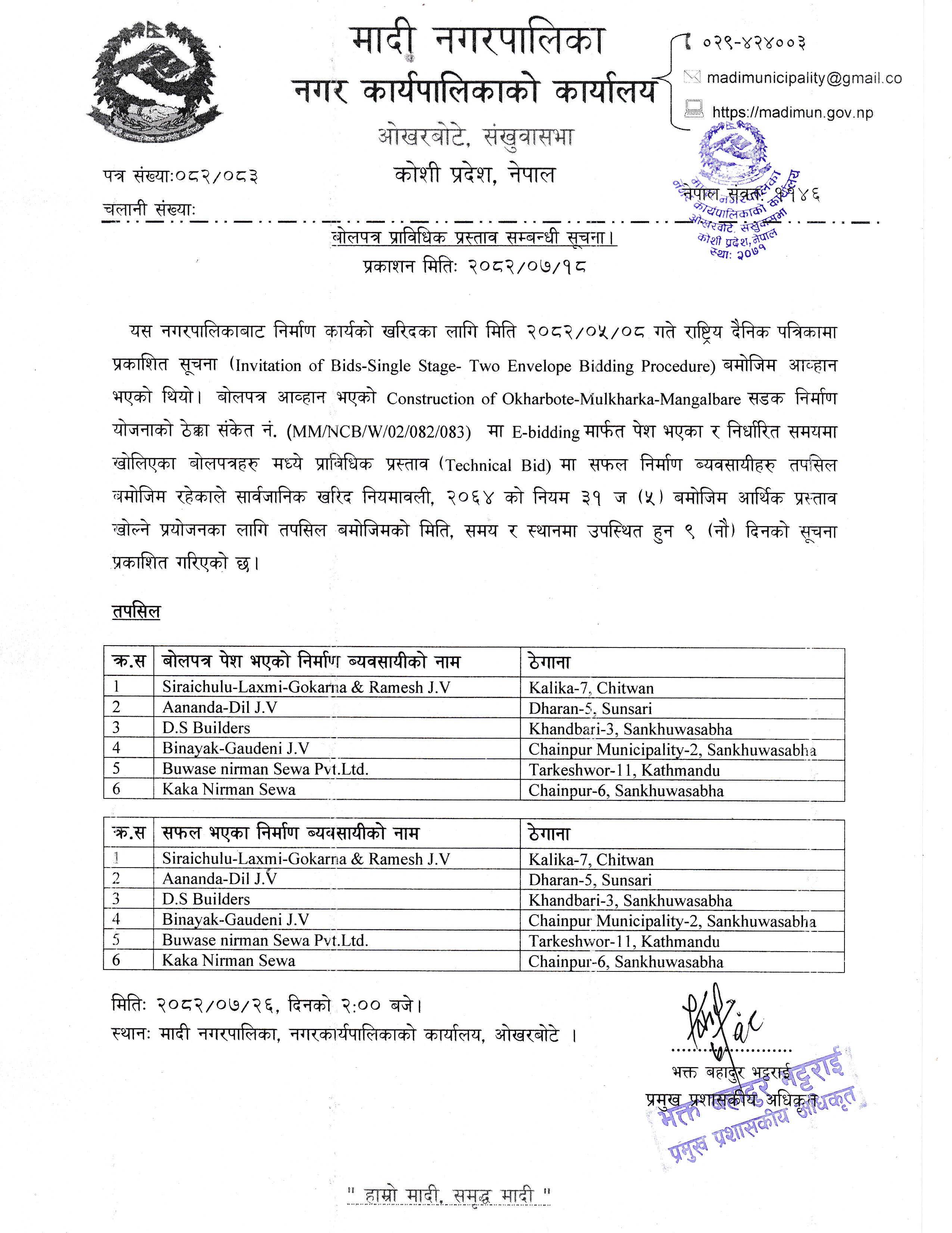 बोलपत्र स्वीकृत गर्ने आशयको सूचना ।