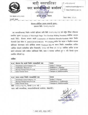 बोलपत्र प्राविधिक प्रस्ताव सम्बन्धि सूचना ।