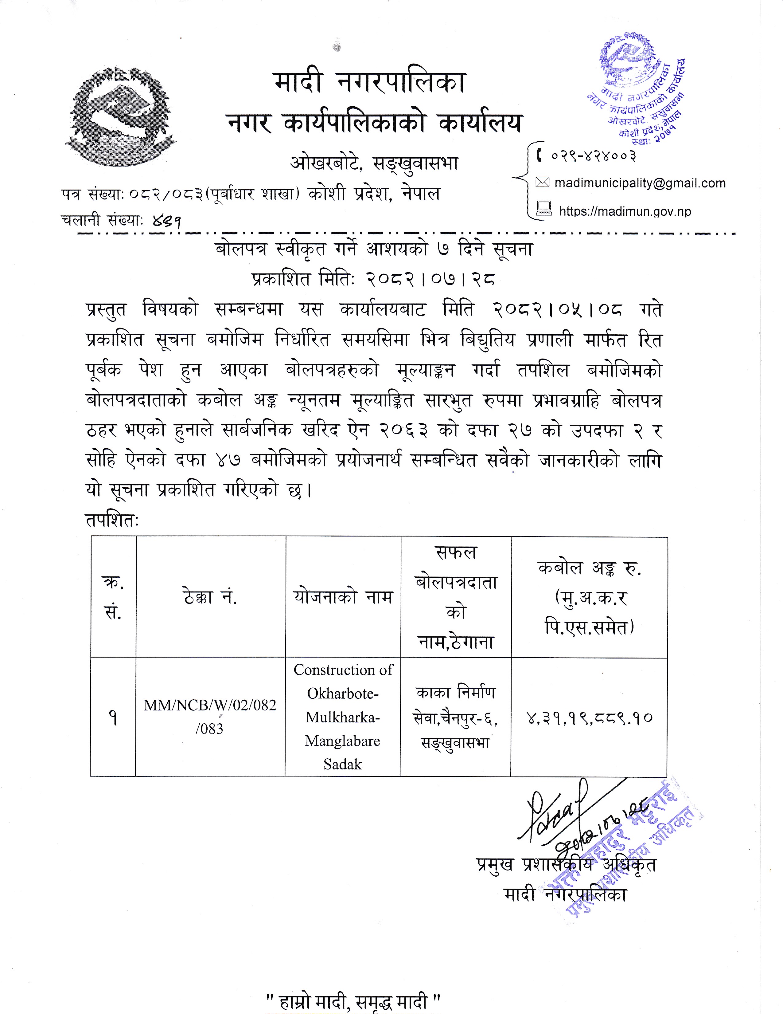 » बोलपत्र स्वीकृत गर्ने आशयको ७ दिने सूचना प्रकाशन ।