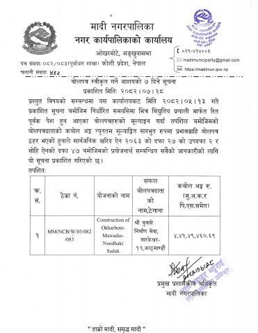 बोलपत्र स्वीकृत गर्ने आशयको ७ दिने सूचना प्रकाशन ।