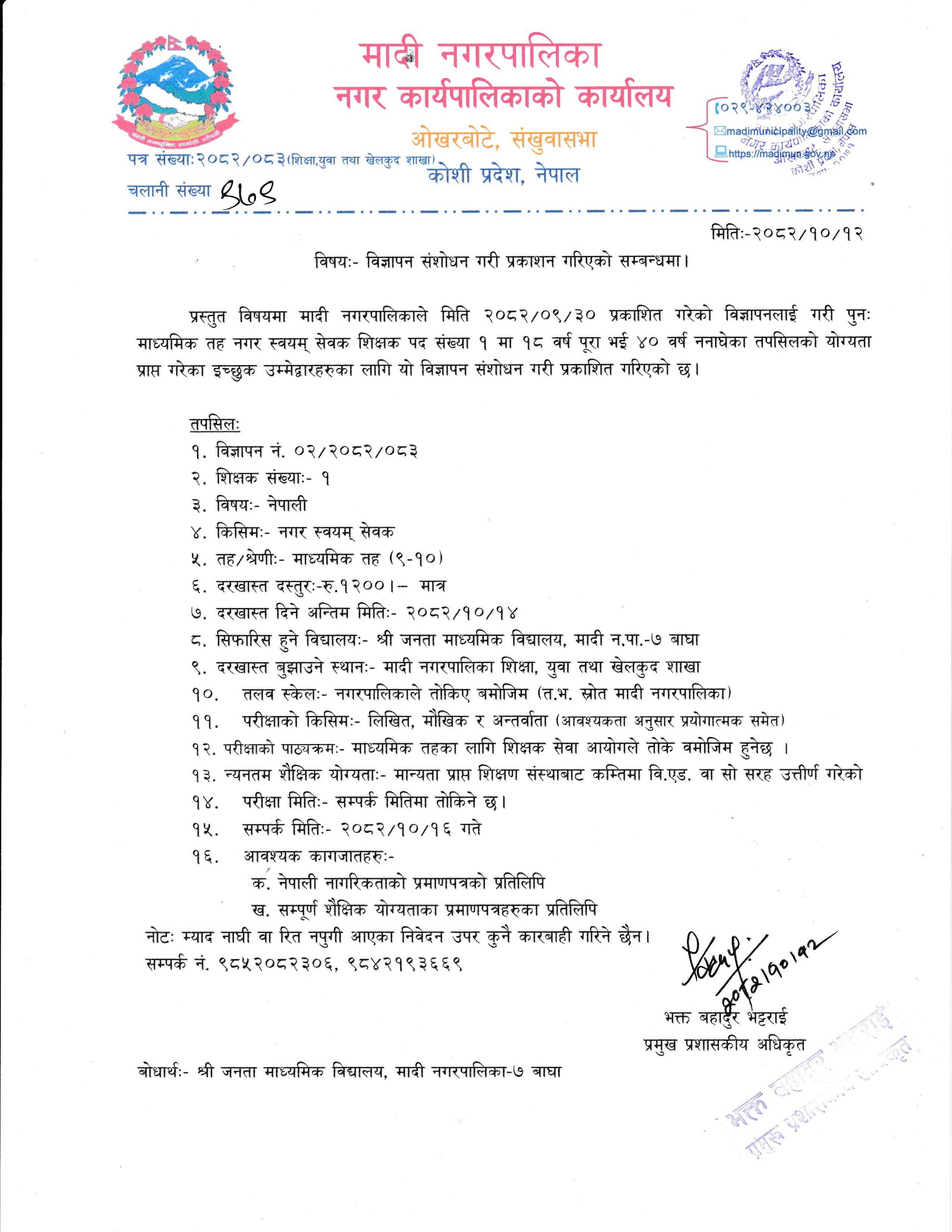 विज्ञापन संशोधन गरी प्रकाशन गरिएको सम्बन्धमा ।